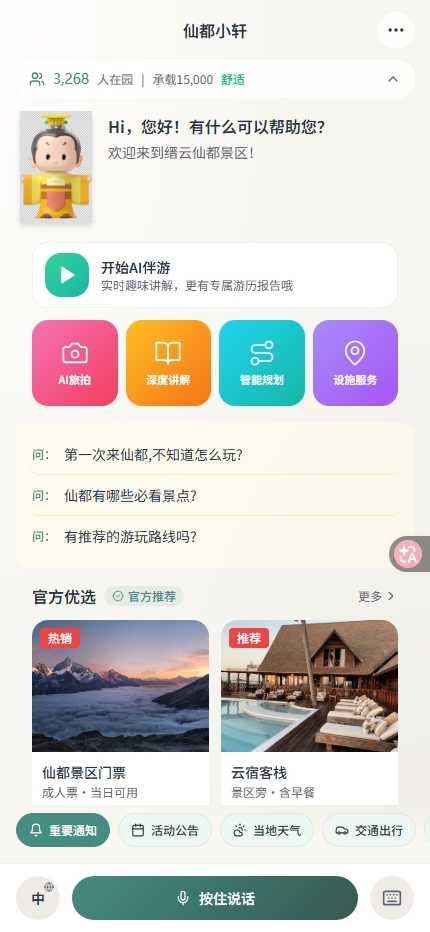 为缙云仙都景区打造的AI智能体微信小程序,集AI伴游、智能讲解、AI旅拍、数字人导游于一体,覆盖游前规划、游中陪伴、游后分享的全链路智慧旅游体验。